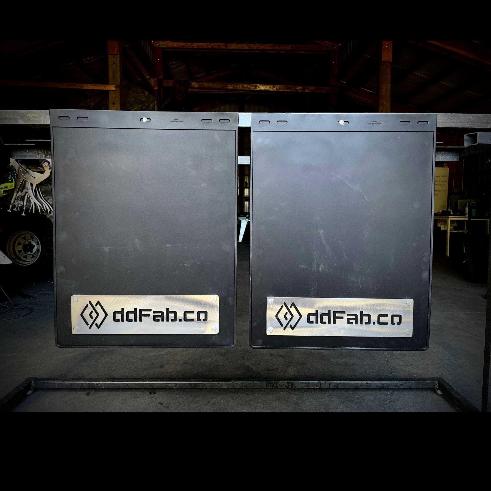 Free shipping in lower 48 states. Mud flaps and ddfab.co tags. Mud flaps are 18″ x 24″ and can be used on either SRW or Dually beds. Note: comes as a set of two mud flaps and two raw steel ddfab.co tags made from 12 guage steel and mounting hardware. Customer is required to coat the tags with their choice of finish (paint/powdercoat, etc.) and mount the tags to the mud flaps.