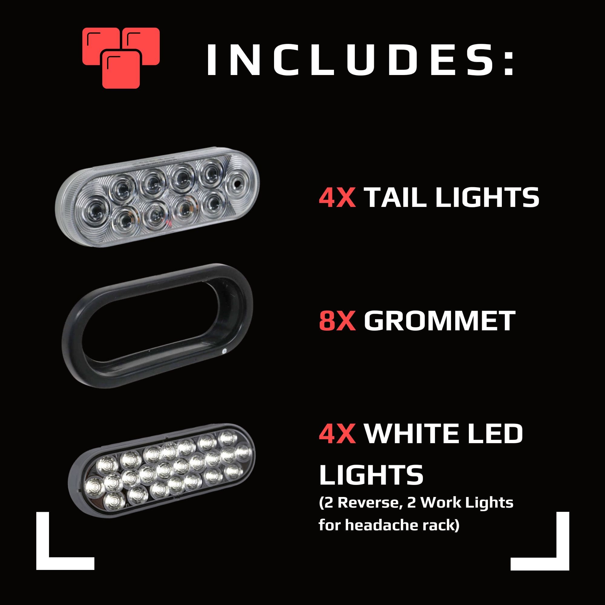 - 4x Oval Clear White Lights – reverse and headache rack work lights (Lifetime Warranty)