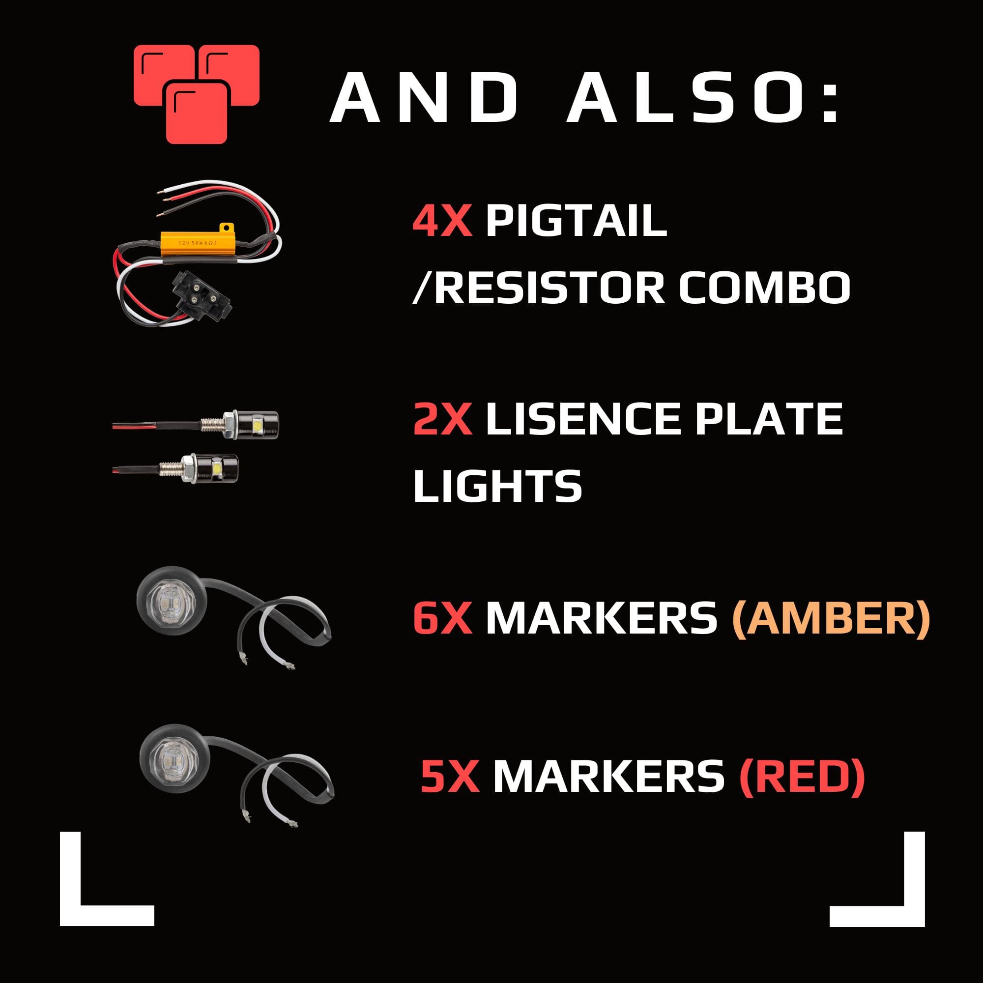- 6x Clear Lens Amber Marker Lights (Optronics brand, lifetime warranty)