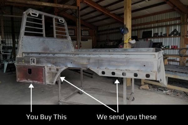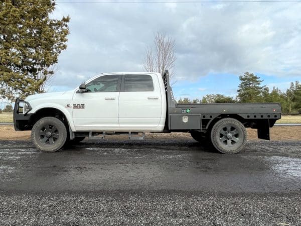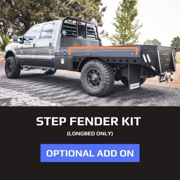 Toolbox/step fender designed to be used with 30″ long toolbox on long bed models only. Wheel cutout will be 56″ back from cab to center of axle if kit is used with 30″ long under body toolbox. Includes both driver and passenger sides. Fenders are 4.5 inches deep. bottom of step is 14″ inch deep. Built from 3/16″ thick steel.